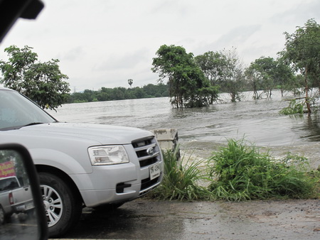 รถชาวบ้านส่วนใหญ่จอดอยู่ริมถนนครับ  ส่วนคนที่ไม่เอาออกมาก็ยกสูงด้วยการเอาไอ้เข้คอยเอากระสอบทรายหนุนให้สูงตามระดับน้ำครับ