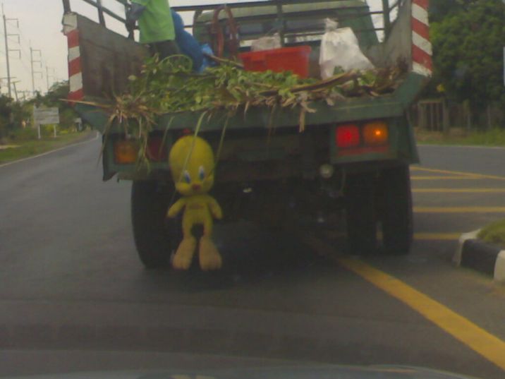 ขับบนทางด่วน เผอิญไปเจอกระบะคันนึง สะดุดตามากมาย เล่นห้อยพี่ม่อนตัวเบ้งไว้ท้ายรถ เลยขับตามตูดถ่ายรูปมาให้ดูกันคับ