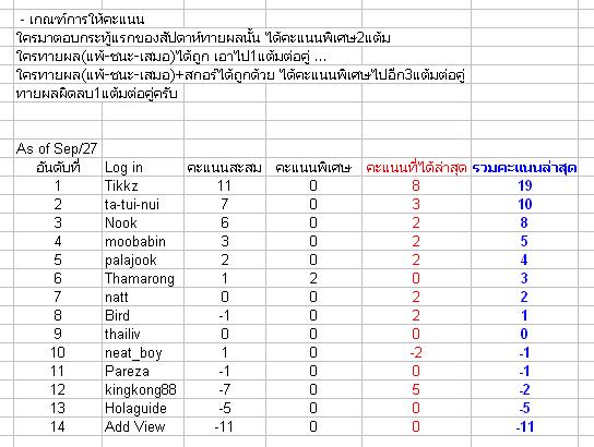 หมายเหตุ : ใครร่วมเล่น ให้ทายทุกคู่นะคร๊าบ วันอังคารที่ 25 กันยายน : 01.45 เรดดิ้ง 2 - 4 ลิเวอร์พูล live ch-7 อาร์เซนอล 2 - 0 นิวคาสเซิล วันพุธที่ 26 กันยายน : 01.45 ฮัลล์ ซิตี้ 0 - 4 เชลซี live ch-7 แมนฯยูไนเต็ด 0 - 2 โคเวนทรี ปรี๊ดดดดดด เริ่มได้ ใครตอบคนแรก เอาคะแนนพิเศษไป2 แต้ม ทายถูก+1 ทายผิด -1 ทายสกอร์ถูกด้วยรับคะแนนพิเศษไปอีก +3 ปิดรับคำทายก่อนบอลเตะ คะแนนสะสมล่าสุด