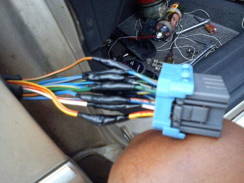 6. เมื่อทำเสร็จแล้วจะได้ออกมาแบบนี้ครับ ส่วนสายไฟ 2 เส้น มุมบนซ้าย คือ สายไฟกันขโมยที่เดินใหม่ ลอดออกจากภายในรถผ่านท่อยางสีดำ