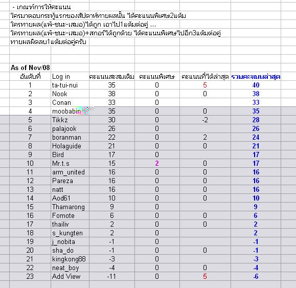 งวดนี้ได้คะแนน 0 กันหลายคนเลยครับ แต่ที่ไม่น่าเชื่อคือบ้วยม่อนทายถูกมากที่สุดเท่าผู้นำต๊ะลิเวอร์พูล & เบซิคตัส  ชาลเก้ 0-0 เชลซี วันพุธที่ 7 พ.ย. 2550 แมนฯยูฯ 4-0 ดินาโม เคียฟ สลาเวีย ปราก 0-0 อาร์เซนอล ( สรุปคะแนนล่าสุดของสมาชิกแต่ละท่าน )