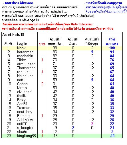 ปรี๊ดดดดดดดดดดดดดดดดดดดด ปรี๊ดดดดดดดดดดด ปู๊ดดดดดดดดดด เริ่มทายได้ ใครร่วมเล่น อยากให้ทายทุกคู่นะคร๊าบหมายเหตุ : ใครที่ขาดการทายติดต่อกันเกิน3 แม็ทช์ชื่อจะโดน Hide ไปนะครับ แต่ถ้ากลับเข้ามาทายอีก คะแนนที่มีอยู่เดิมจะโดนหักไป4แต้ม และยกเลิกการ Hide คืนวันเสาร์ที่ 16 ก.พ. 2551 เป็ดแอนฟิลด์ 1-2 เทพบาร์นสลีย์ หอยลอนดอน 3-1 เทพฮัดเดิลส์ฟิลด์ ผีลงแดง 4-0 ปืนเจ๊แวงค์ ** พิเศษเฉพาะคู่ผีกะปืนด้านบน เนื่องจากเจอกันเอง เฉพาะคู่นี้คะแนนจะคูณ 2 เท่าทั้งบวกและลบ ( สรุปคะแนนล่าสุดของสมาชิกแต่ละท่าน )