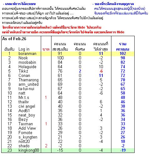 ใช่ครับ ทายแค่ในเวลา 90 นาที ยูฟ่าแชมป์เปี๊ยนส์ลีกคืนวันอังคารที่ 19 ก.พ. 2551 ลิเวอร์พูล 2-0 อินเตอร์ มิลาน โอลิมเปียกอส 0-0 เชลซี คืนวันพุธที่ 20 ก.พ. 2551 อาร์เซนอล 0-0 เอซี มิลาน ลียง 1-1 แมนฯยูฯ +++++++++++++++++++++++++++++++++++++++++++++++++++++++++++++ อิงลิชพรีเมียร์ลีก คืนวันที่ 23-24 ก.พ. 2551 Liverpool 3-2 Middlesbrough Birmingham 2-2 Arsenal Newcastle 1-5 Man Utd มิ๊กกี้เมาส์คัพ นัดชิงชนะเลิศ คืนวันที่ 24 ก.พ. 2551 สเปิร์ม 1-1 หอย ต่อเวลา สเปอร์ชนะเชลซี 2 -1 สรุปคะแนนล่าสุดครับ ท่านปออ้วนขึ้นมาเป้นผู้นำเทียบเท่านายกสมัคร
