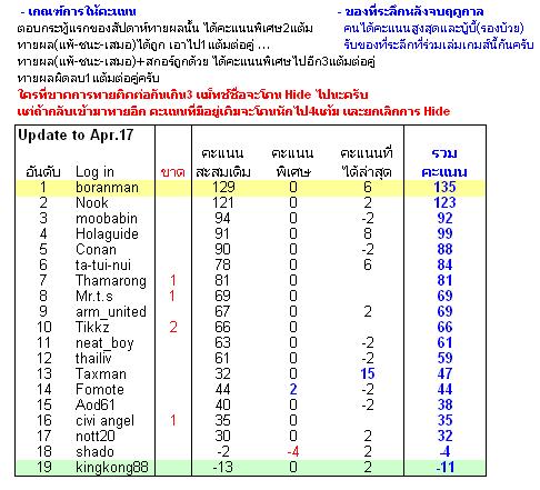 แต่ถ้ากลับเข้ามาทายอีก คะแนนที่มีอยู่เดิมจะโดนหักไป4แต้ม และยกเลิกการ Hide