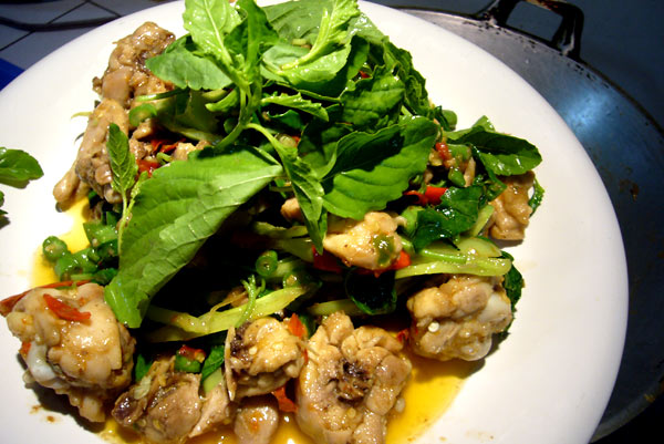 คลุกเคล้าให้เค้ากันได้ที่ ก็เอาใบกระเพรา และพริกใหญ่ซอย ใส่ลงไป