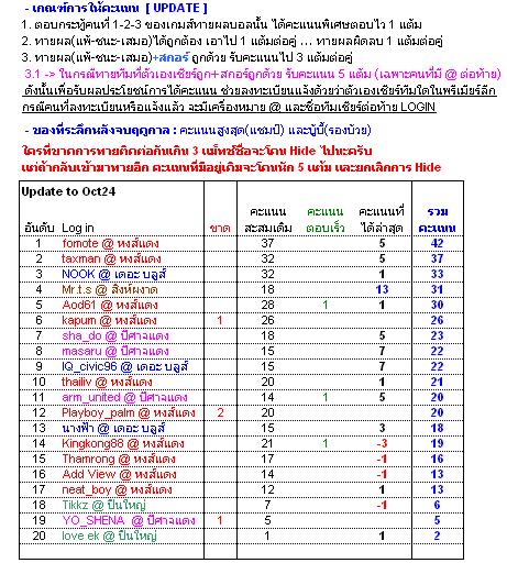 อ่านเกณฑ์การให้คะแนนในตารางนะครับ  ใครอยากได้คะแนนเพิ่มแจ้งทีมที่เชียร์เพื่อใส่ @ทีมเชียร์ ต่อท้ายล็อคอิน