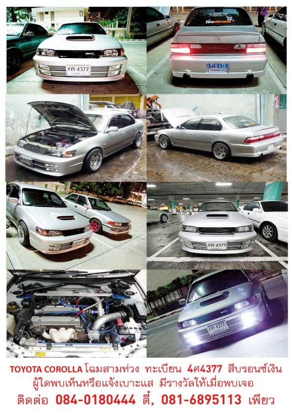 ไหนๆ ผมเล่นเว็บนี้มาเป็นปีละ ฝากเพื่อนๆพี่ๆน้องๆ ที่นี่หน่อยนะครับ ช่วยเป็นหูเป็นตาแจ้งเบาะแสด้วย http://www.aeracingclub.net/forums/index.php?topic=82400.0  หรือ http://www.pantip.com/cafe/ratchada/topic/V10190587/V10190587.html  เป็นรถเพื่อนสมาชิกที่เว็บ aeracingclub.net โดนขโมยทั้งคลุมผ้า กลางดึก 27 ม.ค. แถวๆ ใต้ทางด่วนยศเส ปทุมวัน ครับ รถ โคโรล่า สามห่วง แต่งกันชนหน้า VIP + ฝากระโปรงสคูปอิม + ล้อออฟลึก + ท่อคู่ + วาง ซุปเปอร์ชาร์จ ถ้าโจรมันยังย่ามใจ เอาของร้อนมาวิ่งเล่น ไม่ชำแหละ หรือเผื่อโจรมันเอาไปวิ่งแหย่วีเทค พวกพี่ๆน้องๆที่นี่ หรือ มีของแต่งแปลกๆ หลงมาแถวนี้ ช่วยแจ้งไปทางเบอร์ในรูปด้วยนะครับ ขอบคุณทุกท่านล่วงหน้าครับ