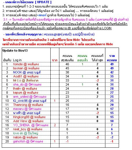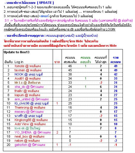 ปรี๊ดดดดดดดดดดดดดดดดดดดด ปริ่ด ปิ่ด เริ่มทายได้ ใครร่วมเล่น อยากให้ทายทุกคู่นะคร๊าบหมายเหตุ : อ่านเกณฑ์การให้คะแนนในตารางนะครับ ใครอยากได้คะแนนเพิ่มแจ้งทีมที่เชียร์เพื่อใส่ @ทีมเชียร์ ต่อท้ายล็อคอิน ปิดรับคำทายสุดท้ายก่อนเกมส์การแข่งขันคู่นั้นๆพรีเมียร์ วันที่ 8 พฤศจิกายน 2551อาร์เซนอล 2-1 แมนฯ ยูไนเต็ด ลิเวอร์พูล 3-0 เวสต์บรอมวิช พรีเมียร์ วันที่ 9 พฤศจิกายน 2551แบล็คเบิร์น 0-2 เชลซี แอสตัน วิลล่า 1-2 มิดเดิลสโบรห์ คาร์ลิ่งคัพ รอบ4 วันที่ 11-12 พฤศจิกายน 2551อาร์เซนอล 3-0 วีแกน แมนฯ ยูไนเต็ด 1-0 ควีนปาร์ค เรนเจอร์ส สเปอร์ 4-2 ลิเวอร์พูลเชลซี 1-1 เบิร์นลี่ย์ ตารางคะแนนล่าสุด