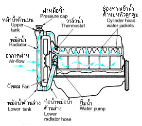 ลองวิเคราะห์ด้วยเหตุและผลกันนะครับว่า ในระบบระบายความร้อน จะมีอุปกรณ์ที่จำเป็นในระบบระบายความร้อน ได้แก่ ปั้มน้ำ (Water pump), วาล์วน้ำ (Thermostat), ท่อยางหม้อน้ำ (Radiator hoses), หม้อน้ำ (Radiator), พัดลมระบายความร้อน (Fan) ทำงานประสานกันคือ นับตั้งแต่สตาร์ทเครื่อง ตัวปั้มน้ำก็จะทำงานโดยได้รับแรงหมุนจากสายพาน ซึ่งต่อมาจากการหมุนพูลเล่ย์ ของแกนเพลาข้อเหวี่ยง การที่ปั้มน้ำทำงาน เป็นผลทำให้มีน้ำใหลเวียนอยู่ในโพรงผนัง ของเสื้อสูบ และบริเวณที่มีความร้อน