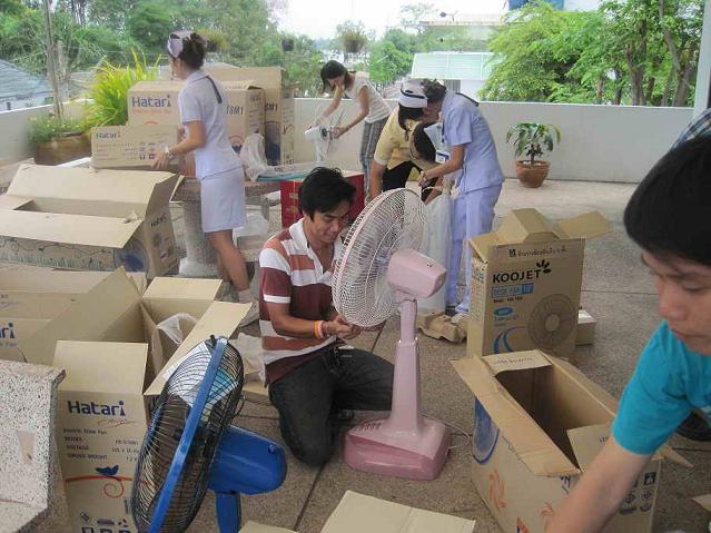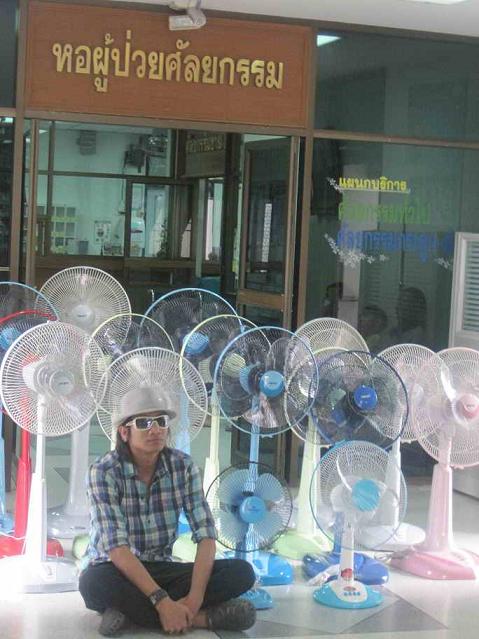 เริ่มปฏิบัติการ ขนพัดลมลงจากรถ สรุปยอด  16 + 1  ตัว แล้วก็ยืนมอง  จะขนกันยังงัยดีหว่า โก้เสนอว่า ให้เชิญคนไข้ลง
